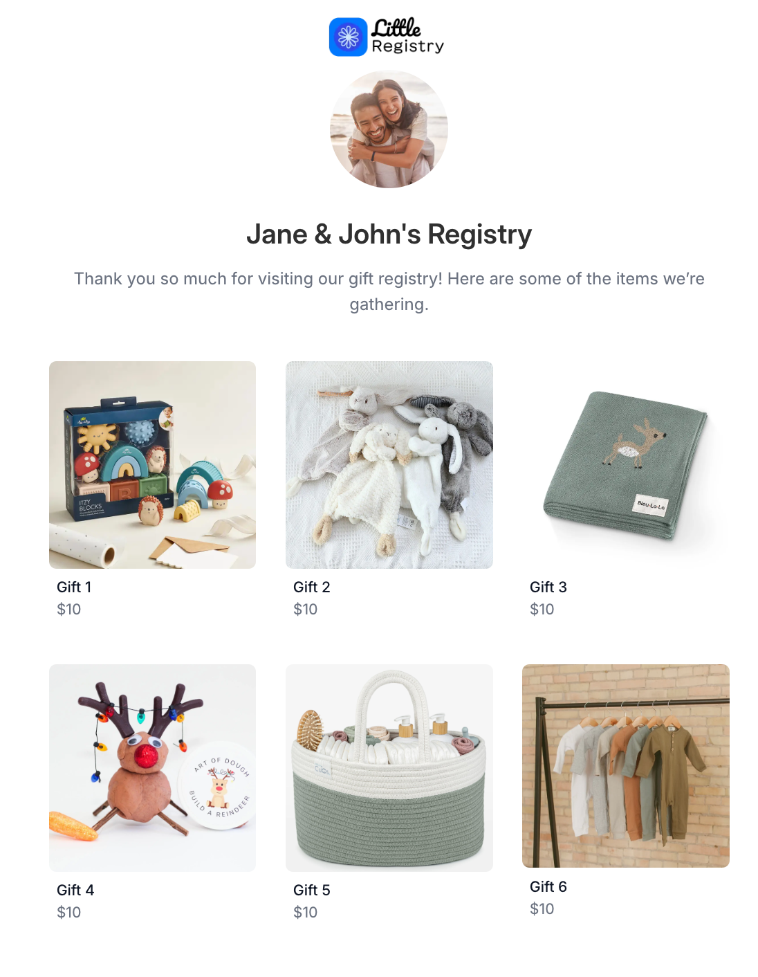 Our Gift Manager lets users easily add, view, and edit gifts in their registry — follow the tutorial to get started.- Name your Gift Registry Program in the onboarding or display settings to set the widget’s display name.