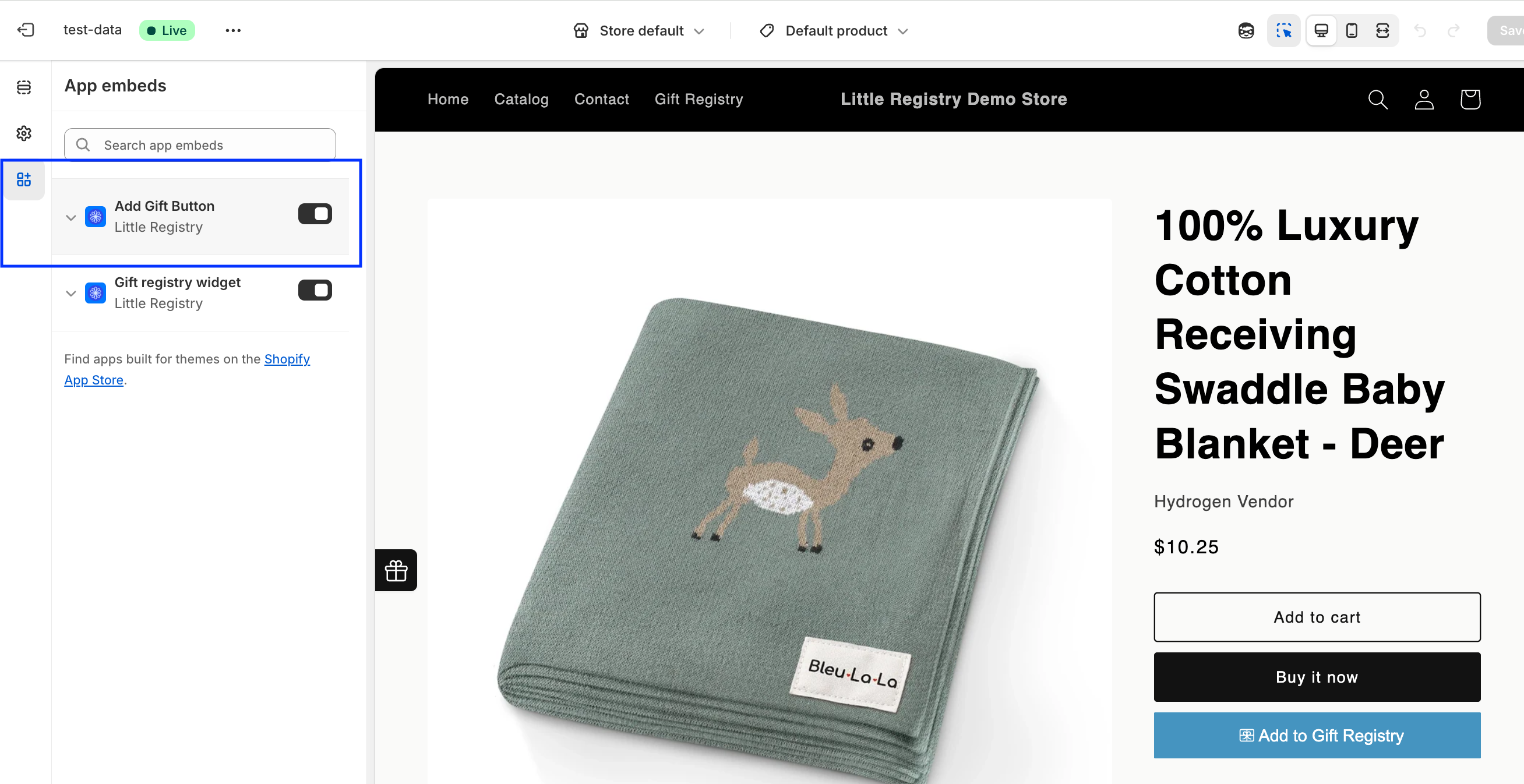 In the left panel, select App Embeds and toggle on Add Gift Button.